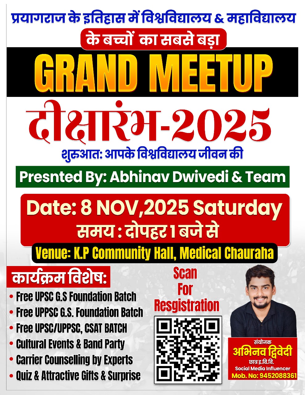 प्रयागराज एक बार फिर से छात्रों के जोश और उमंग का केंद्र बनने जा रहा है। शहर में होने वाला “दीक्षारंभ 2025” (Deekshaarambh 2025) इस साल का सबसे बड़ा ग्रैंड मीटअप साबित होने वाला है। यह आयोजन 8 नवंबर को आयोजित किया जाएगा, जिसमें सैकड़ों विद्यार्थी, युवा और सोशल मीडिया इन्फ्लुएंसर्स शामिल होंगे।